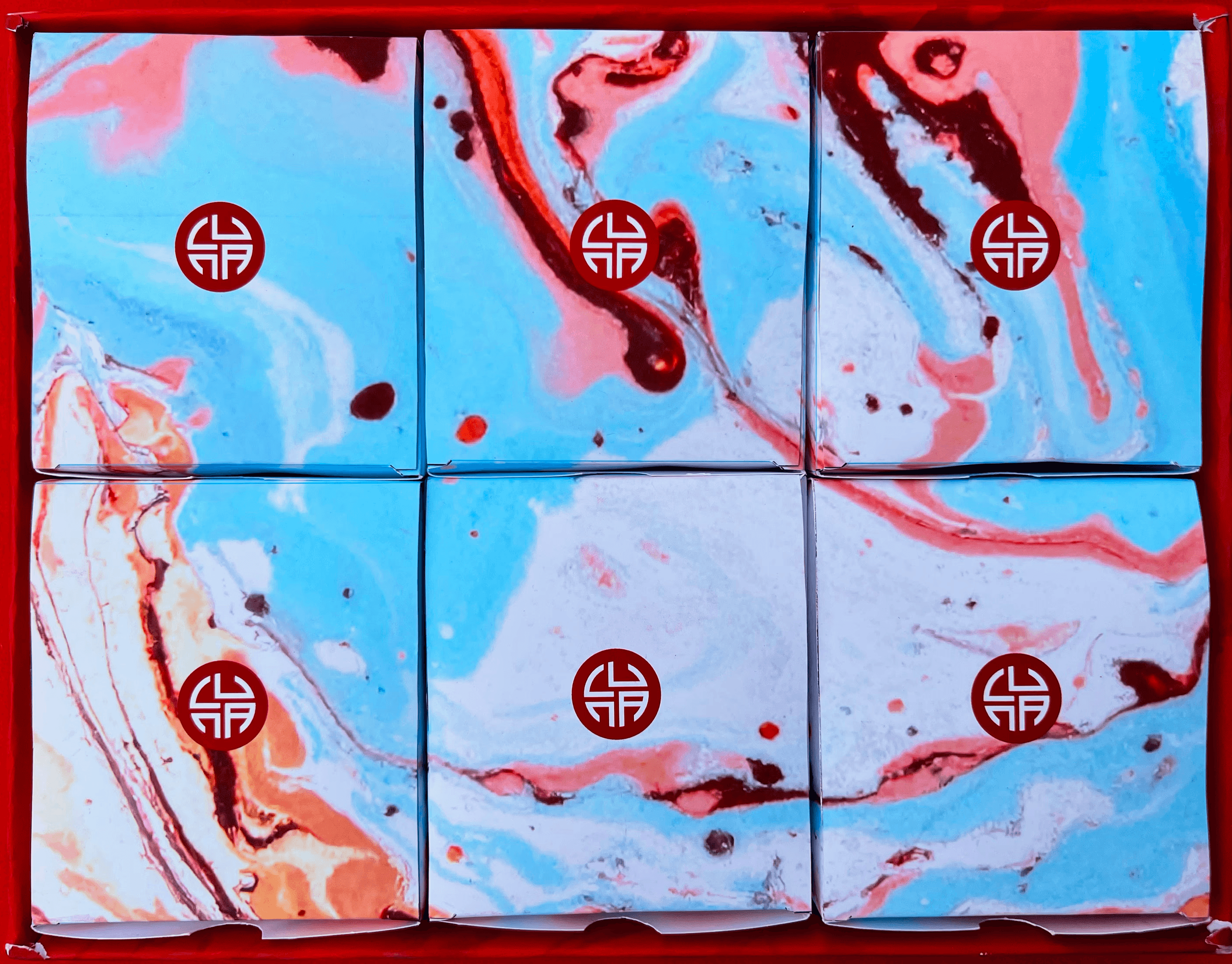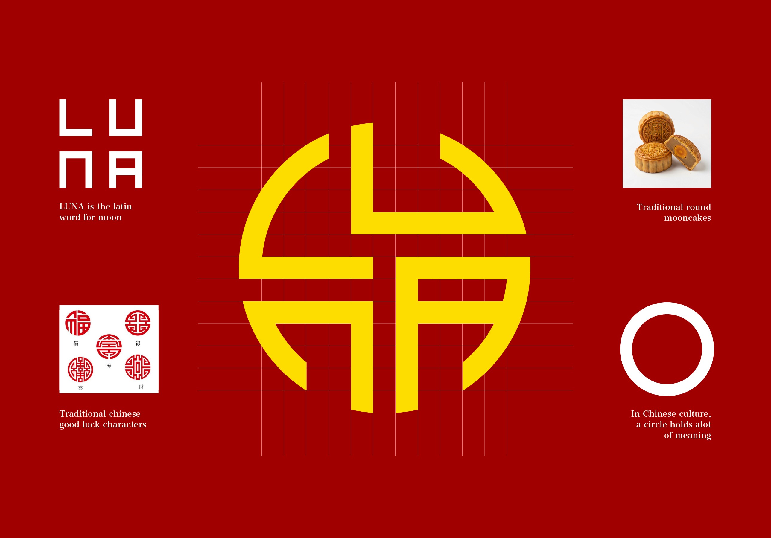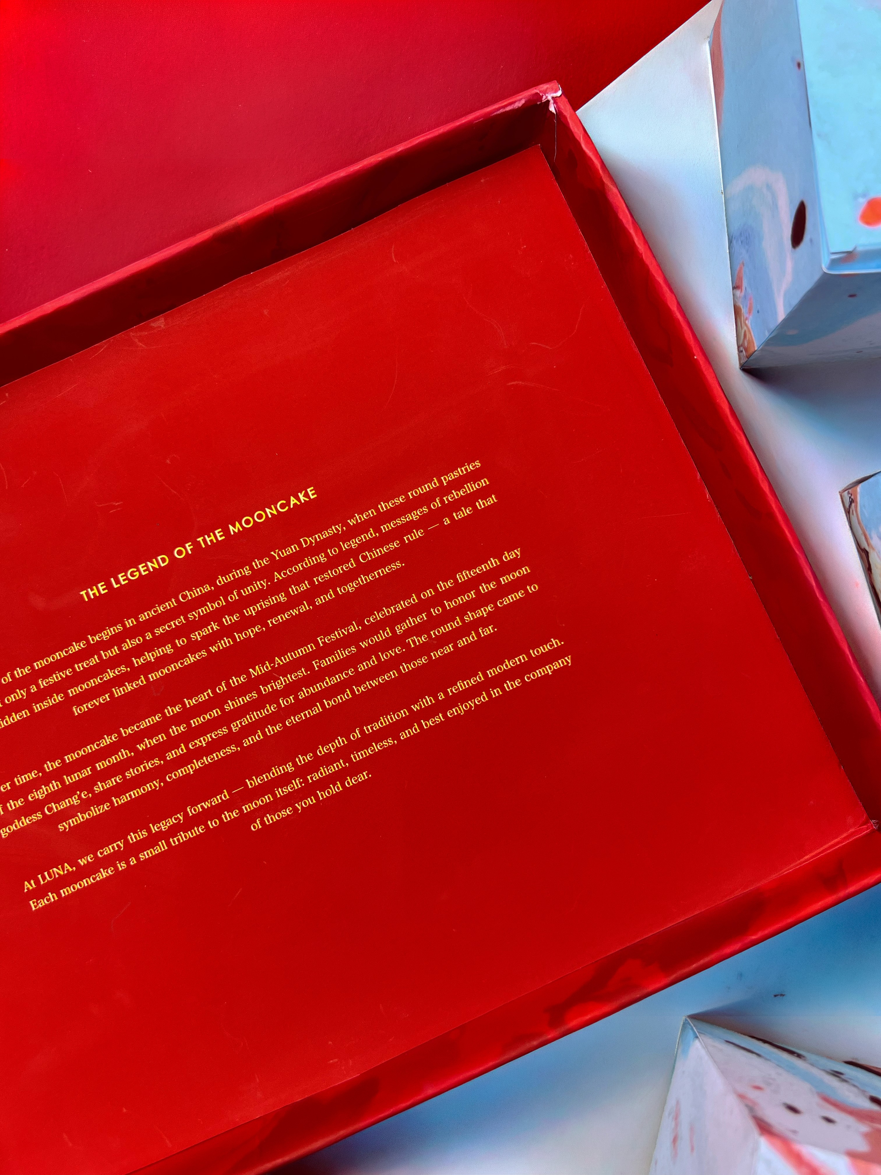 LUNA is a fictional Scandinavian brand, with a luxury packaging concept for traditional Chinese mooncakes. The cakes are rooted in the Mid-Autumn Festival, a celebration of the full moon, togetherness, and gratitude. The circular symbolism of the festival is reflected in the logo, while the overall design focuses on creating a refined and sensorial experience. The deep red and yellow/gold colors references prosperity and festivity in China, and is establishing a strong cultural foundation. The box contains six individual units, highlighting the ritual of sharing. A clean, minimal exterior contrasts with the more vibrant interior, with a pattern inspired by liúshājiān (Chinese water marbling). The design emphasizes atmosphere and occasion, using color, material, and contrast to create a distinct sense of chinese luxury in a Scandi home.