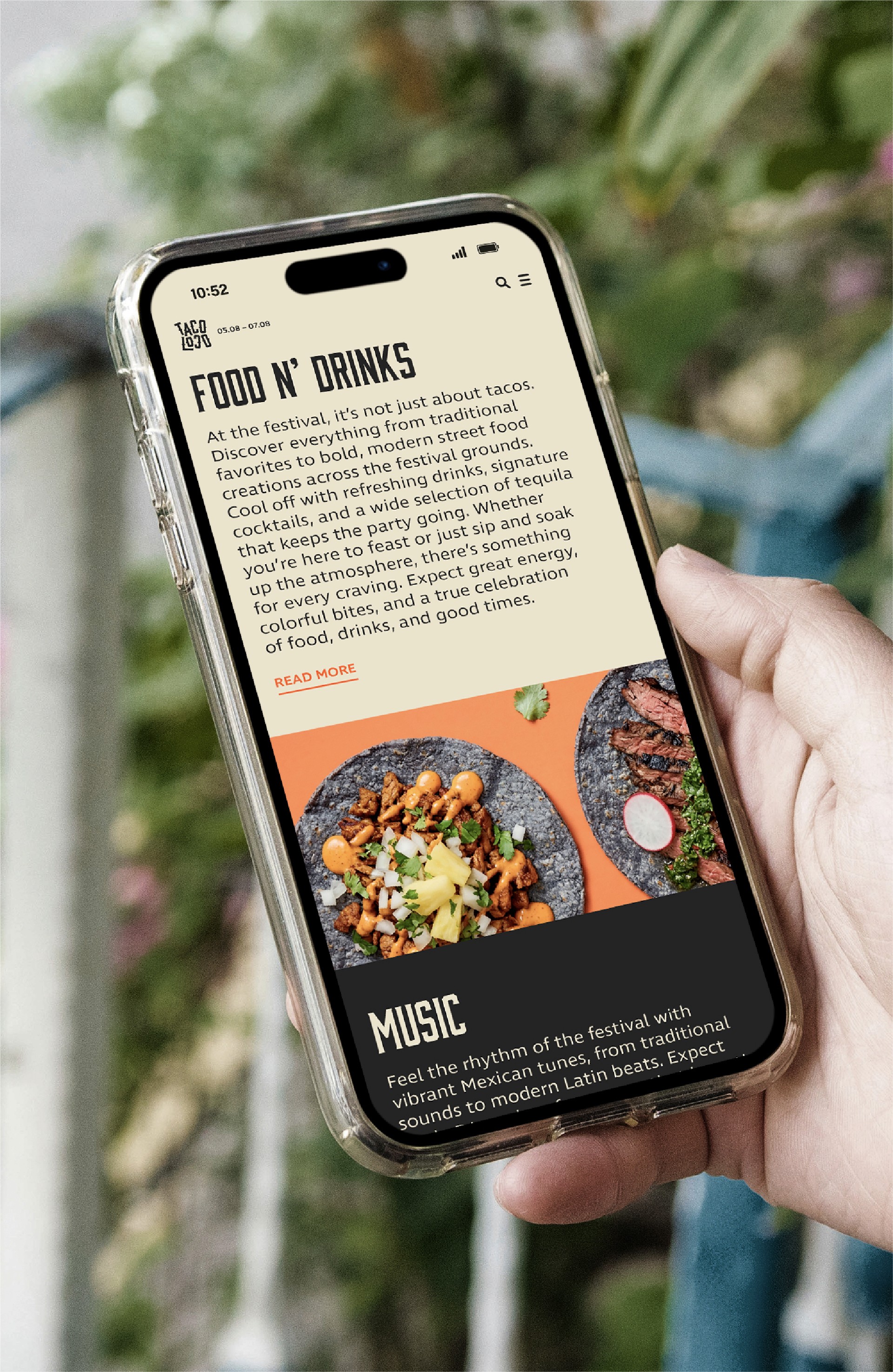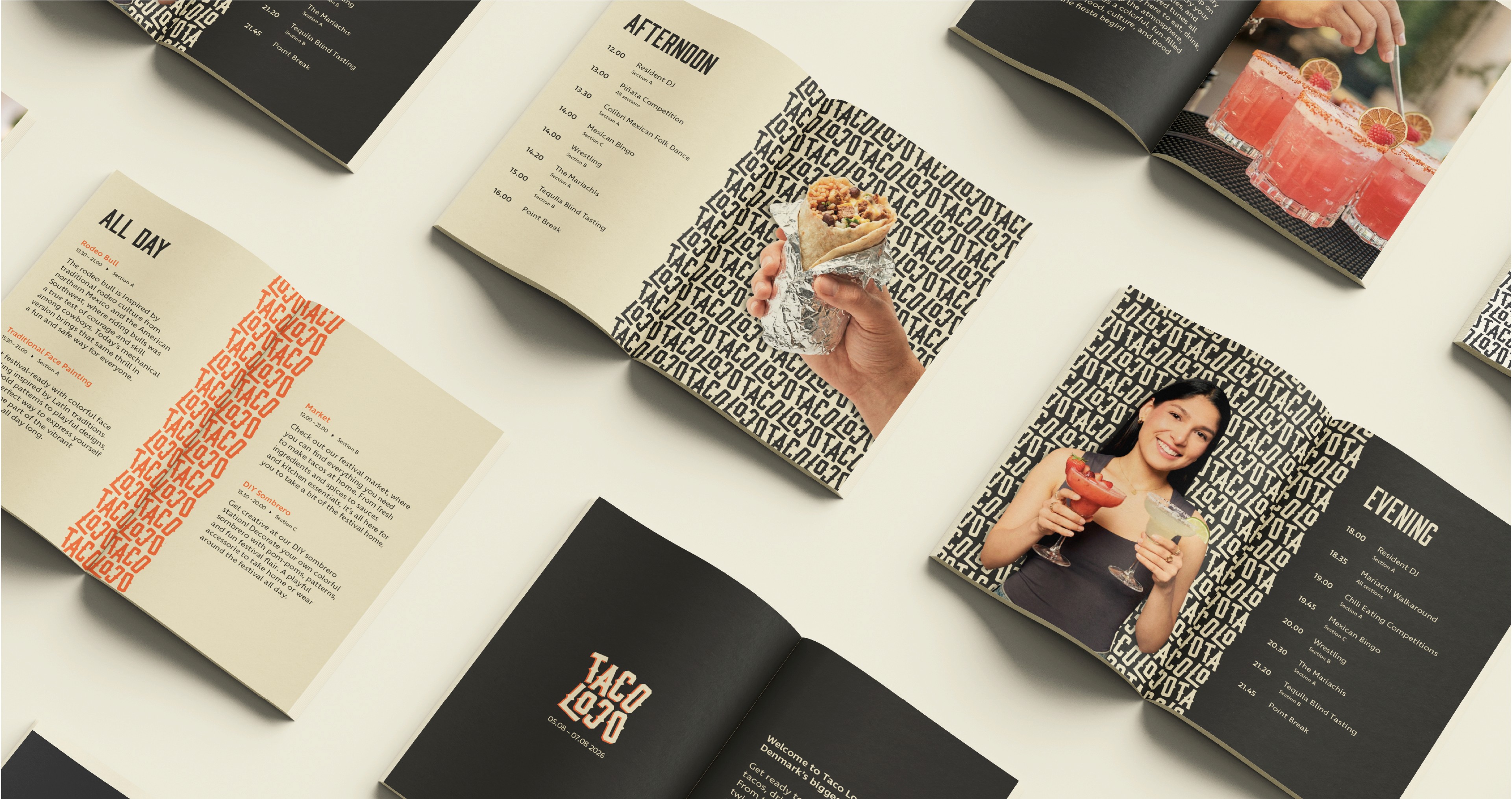 Taco Loco is a fictional festival inspired by the vibrant spirit of Mexican street food culture. The visual identity combines bold contrasts: black, white, and a vibrant orange, to reflect the energy and spice of the event. While the overall design is kept clean and modern, decorative Mexican-inspired elements are used selectively in the design and the logo to add a playful cultural touch.